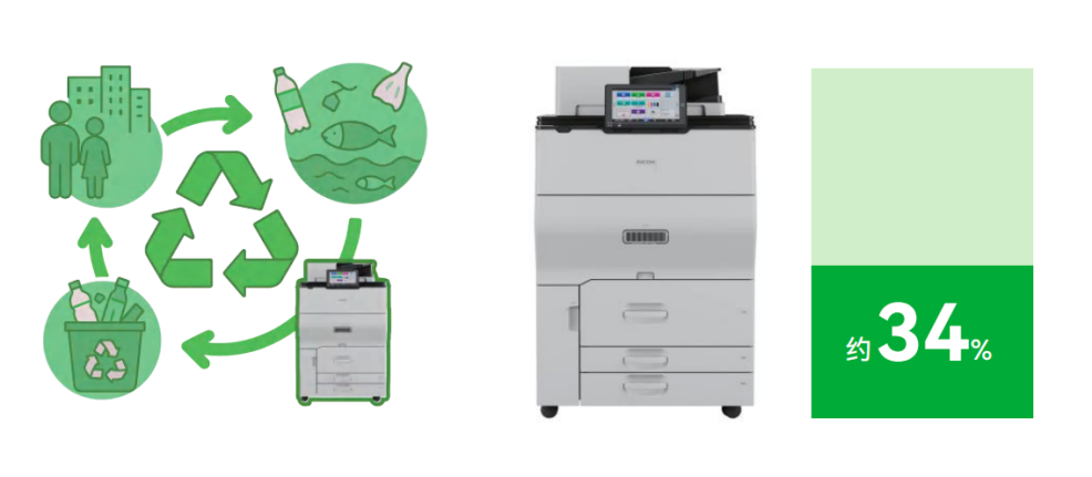 在ESG要求日益严格的背景下,理光IMC8010系列在产品全生命周期中融入循环经济理念。新产品中再生塑料使用率约为34%,机身钢材中约32%采用由废铁电熔炼制的电炉钢板,促进再生资源有效利用,降低环境负荷。设备组装工厂使用的全部电力均来自可再生能源发电,睡眠模式下功耗仅为0.5W,在降低环境负荷的同时有助于削减电力成本。