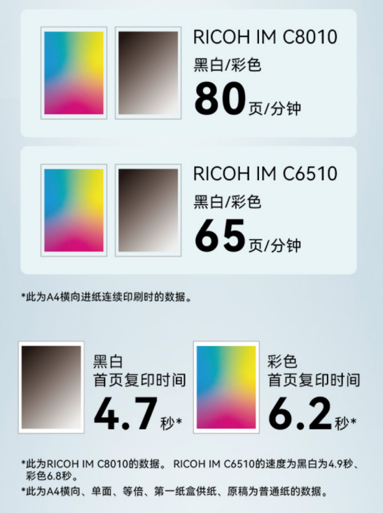 理光A3彩色多功能数码复合机IM C8010/C6510以高性能应对海量挑战,以数智化赋能转型之路,以匠心设计守护绿色地球,以全面安全体系筑牢防线,助力企业迈向高效、智能、可持续的未来。