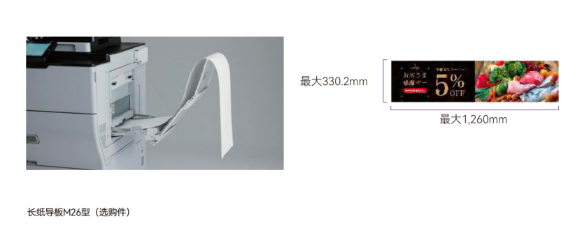 在进纸方面,设备最大进纸容量可达8,100页,搭配旁路大容量纸盒,显著减少频繁添纸的麻烦。设备可自动切换装有同规格纸张的其他纸盒,确保输出任务连续不间断。打印分辨率高达4,800dpi×1,200dpi,实现精细图像输出,提升全彩作品的细节表现力与色彩层次感,轻松胜任营销海报等打印任务。此外,设备标准配备长尺寸印刷功能,支持1,260mm超长打印,可输出长幅POP、展会横幅等营销物料,并支持直接从标准纸盒输出明信片、信封等特殊纸张,提升日常办公效率。
